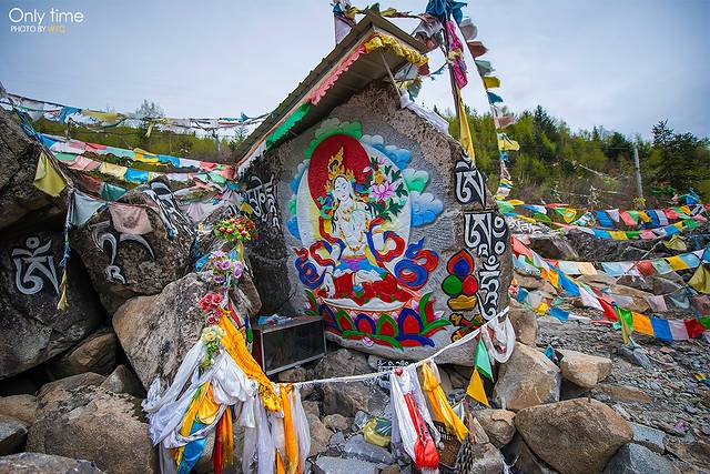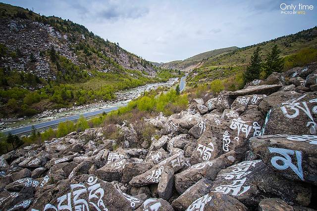 待转过一个弯路后,立刻被眼前的景象所惊呆!将近2公里的玛尼石,每一块石头上都是雕刻并涂上染料的,这将是多少工匠的多少岁月,完成的壮丽景象啊!