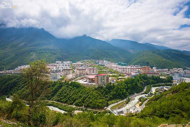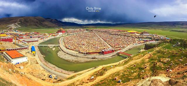 我沿着风吹来的方向,来到修行山的边缘,心中不由得一阵感叹,蜿蜒的河流宛如一条彩带,环绕着千百间红色的小屋,青云在远山之上匆匆的抚过,飞鸟伴着疾风在天空中盘旋,阳光在云朵的间歇间,撒向这一片净土,第一眼见到的亚青全貌竟然如此的震撼!
