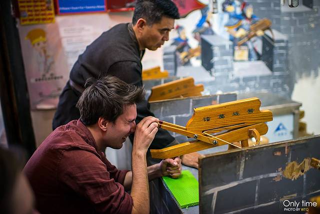 一位帅帅的歪果小伙儿,坐下来耍起了诸葛连弩,看老板都没有教他,他熟练的动作,应该是玩了不止一次了。