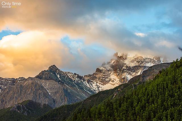 亚丁第二日,我站在客栈的露台上,一个晴朗的早晨,淡青色的云彩自上而下,一朵一朵被染成金色,慢悠悠的飘过仙乃日的山顶。