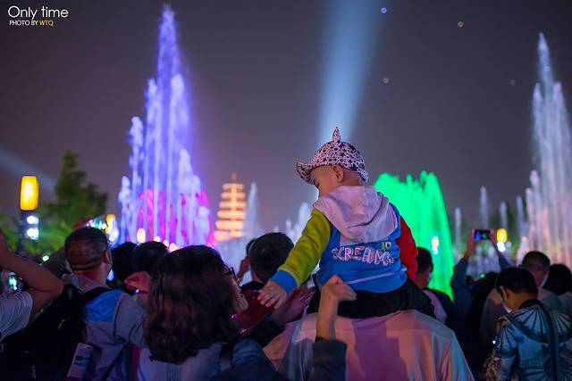 待到20:30分音乐喷泉闪亮开启,被困在外围的我,竟毫无能力挤入人群一睹它的精彩。