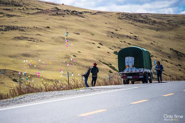 路旁几位藏民一遍呼喊着,一遍向天空飘撒着龙达。