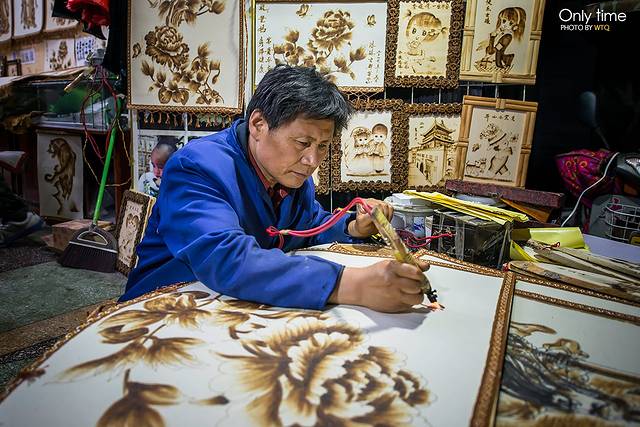 洛阳的牡丹花闻名,火烙画的老艺人,聚精会神的创作着烙画牡丹。