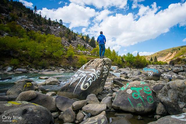背着相机和脚架,再次爬上山坡上的玛尼石,说实话真心很累哈。身体协调性不好者不要效仿啊!因为在错中复杂的石头堆里行走并不是简单的事情。
