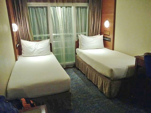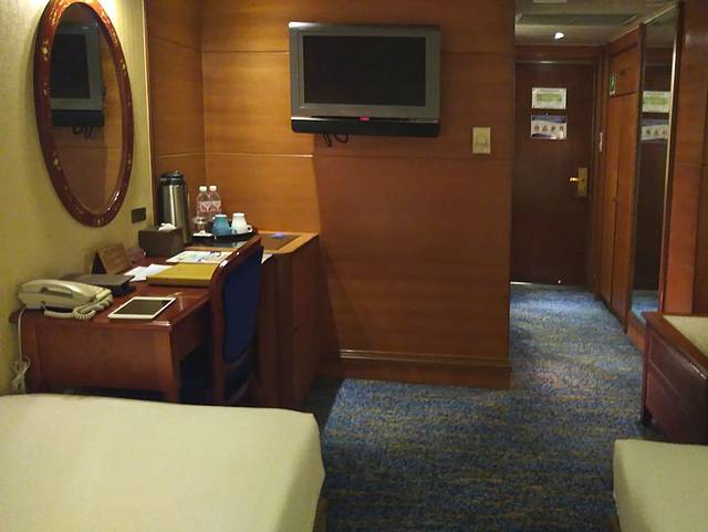 我们乘坐的邮轮是维多利亚凯娅号,共五层,其中二层大厅宽敞,餐厅环境好;五层的杨子酒吧的VIP餐厅环境更好;从二层到五层的房间非常棒,一米宽的双床,桌椅、物品台、衣柜,除下的空间还较大,电视机挂在墙上,阳台还有两把椅子用来闲坐看风景。