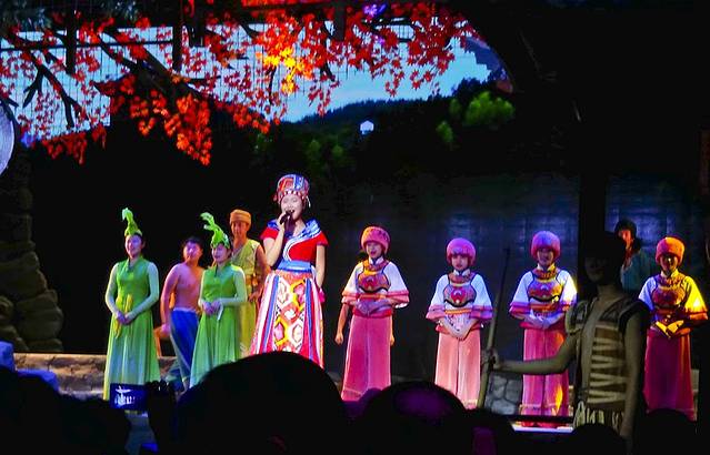 到了最里面的罗平寨看了一场土家族特色表演,从舞台灯光、布景设计到演员水平都不错,只是音响差些。