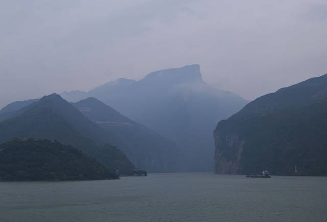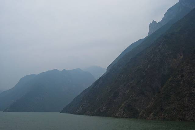 过了巫峡景色一般,3:00左右进入瞿塘峡,只8公里长,是三峡中最短的一个,却最为雄伟险峻。著名的“夔门”两岸断崖壁立,高数百丈,宽不过百米,形同门户,“夔门天下雄”,是10元人民币后面的图案。