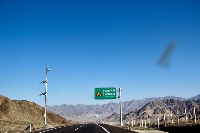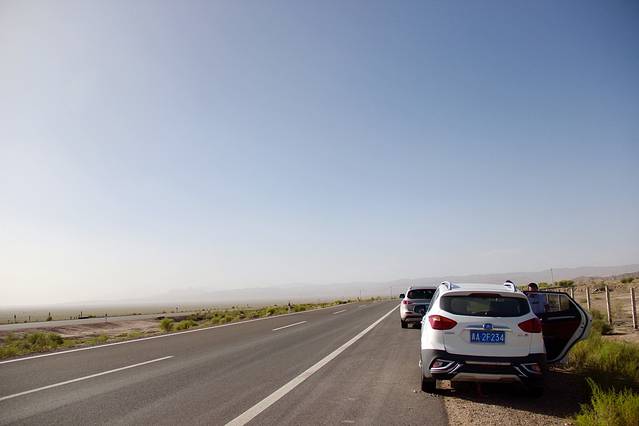 路上车少了,马路是直直的,很多路段都可以拍照,大片的戈壁很上相。