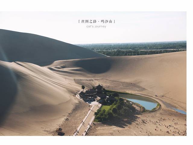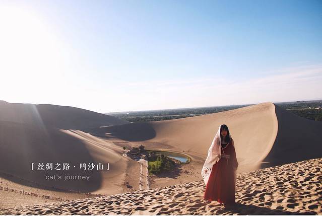 爬到半山时就能看到另一边的月牙泉了,我们没有再走过去了,实在是太晒太累了,就在沙丘上休息了会,拍了些照片。