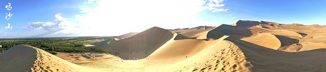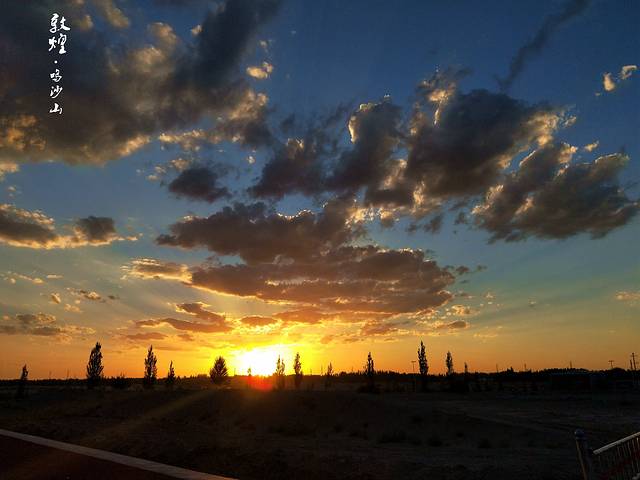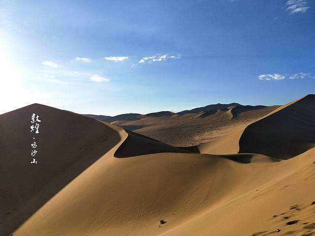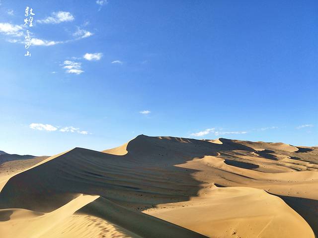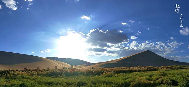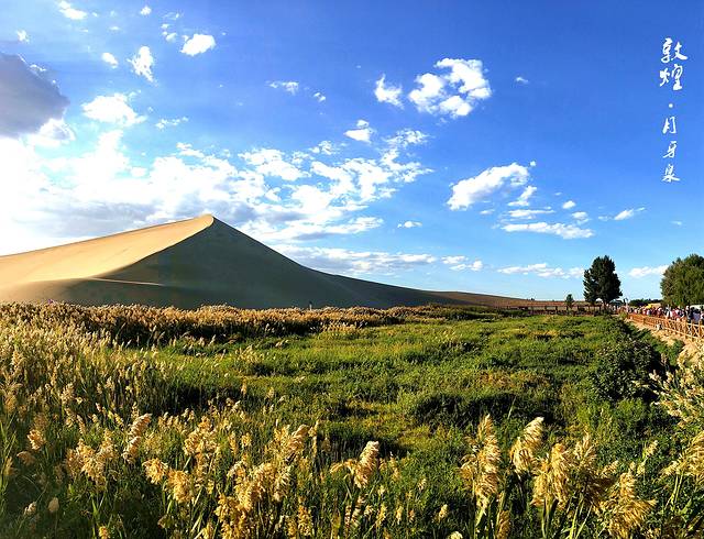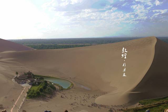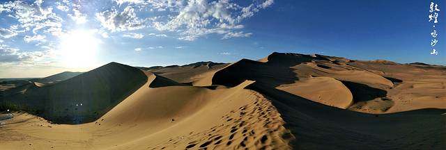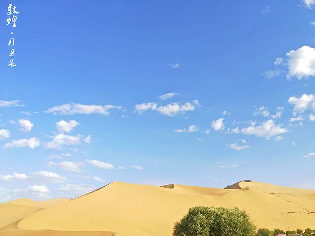 鸣沙山,以它的沙和月牙泉而得名,很小的时候就听说过课文中的月牙泉,但是一直都没有在现实生活中看到过这样奇特的一弯月牙泉,在沙漠中没有干涸,周边还孕育出了许多绿植,匪夷所思。我也因到达后的蓝天白云太耀眼而感到欣喜万分,这里的云那么的低,好像触手可及,却遥不可及。一排一排的骆驼从我眼前走过,在鸣沙山形成了独特的风景画卷,西北的日落很迟,八点半左右才正式落下山去,所以看日落的最佳时间就在八点到八点五十之间,我们订好了晚上沙漠露营,需要出来到达鸣沙山的后方,因此七点半已经在景区门口了,由于时间问题,老板安排的车一直没有到,到了后又等了二十分钟的时间才出发,真不知道是怎么搞的,害得我们只有在车上欣赏了日落的风景,但那金灿灿的晚霞一辈子难忘。