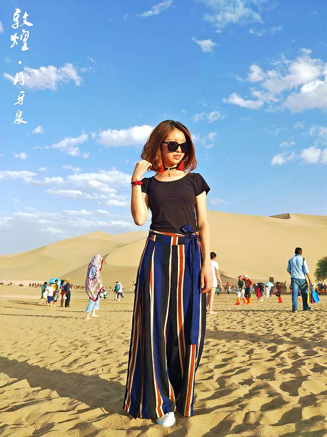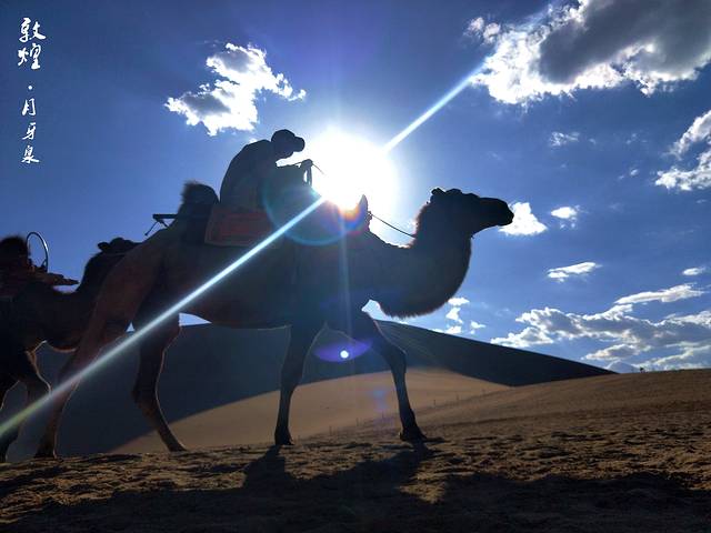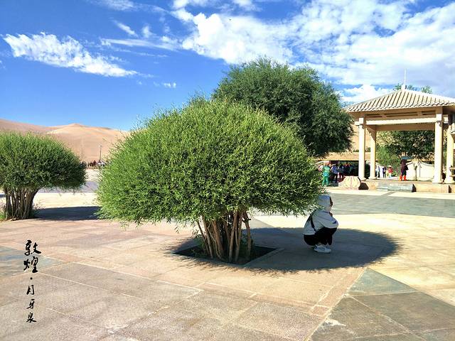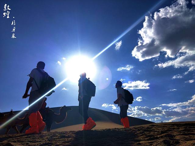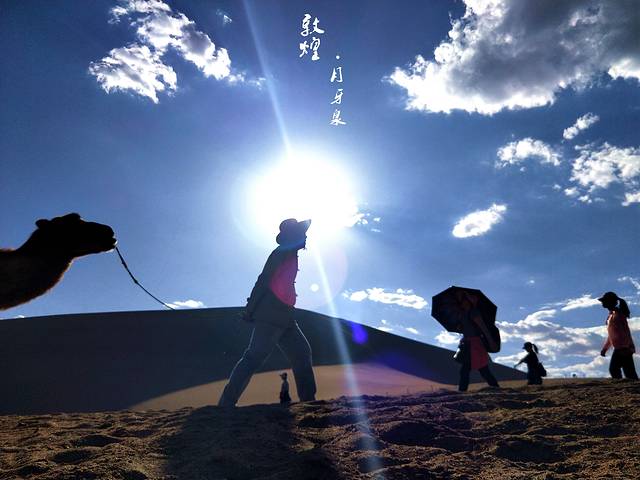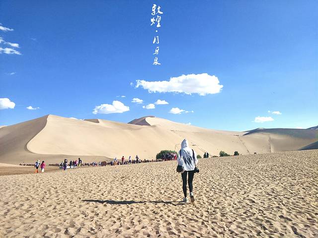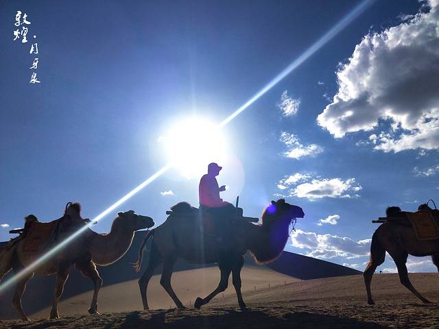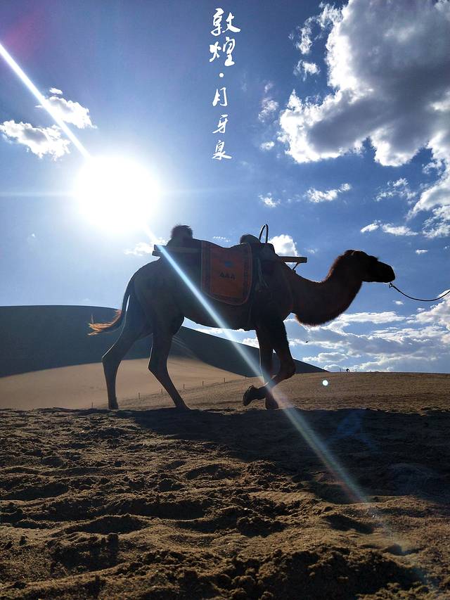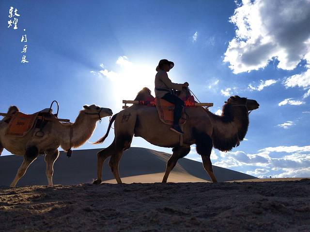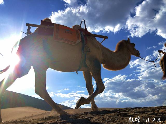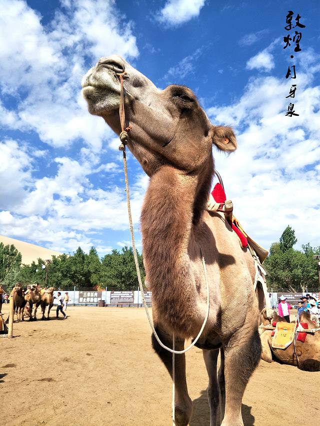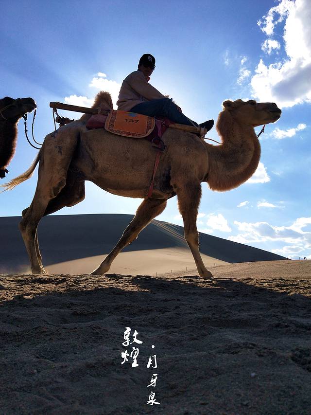 一步三回头,我们终于不舍的下了山,这时候老板都很出乎意料,怎么还有两个人没有走,我们不好意思的说日出太美了,其实是因为拍照花了太久的时间。收拾好自己的东西,在简陋的卫生间洗漱完毕,我们在老板的护送下走出了营地,回到了小镇上,吃了个早餐,景区外的早餐确实有些贵,我们吃完早餐,凭着昨日的自拍照,不需要排队,就进入了月牙泉,同样的地点,不同的风景。因为kk一直想去体验骆驼,本来我是有点犹豫的,想着算了,还是去吧,于是我们也跟着大流去排队,四十分钟左右,到了我们,缴纳了200元大洋,跟着进去排队,果然是旺季,人满为患的等待着骆驼的归来再出发。