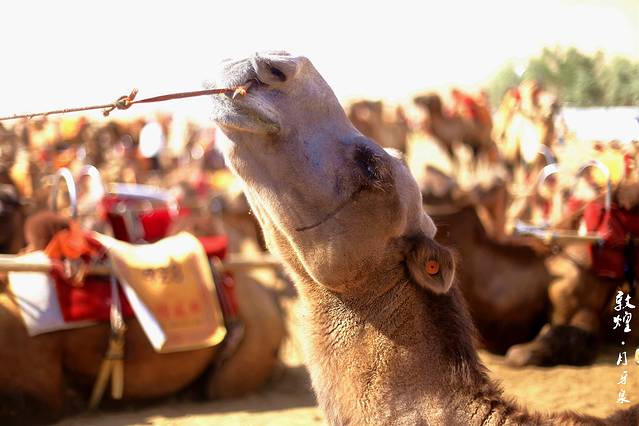 五六点的鸣沙山,日落尚早,kk坐在大树下乘凉,和当地的工作人员攀谈起来,于是我默默的跑去拍骆驼走路的样子,一拍就是一两小时过去了。一队队骆驼在引路人的引路下络绎不绝的经过我的眼前,有的骆驼好奇的看着我,似乎眼神在说:你为什么这样好奇的看着我呀?有的骆驼骄傲的扬起自己的脖子,看也不看我一眼,傲娇的走了过去;有的骆驼一脸茫然,习惯成自然的走过我的眼前,渐渐的消失在小山坡的起点。骆驼的人生就如我们的人生,有的习以为常,有的反抗,最后也只剩下妥协,有的心里有着自己的目标,却被现实压完了腰。