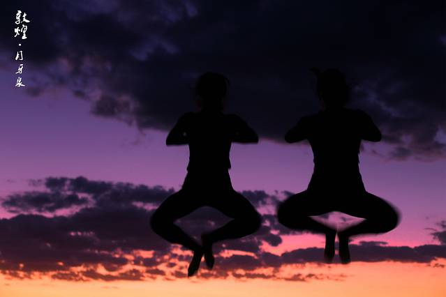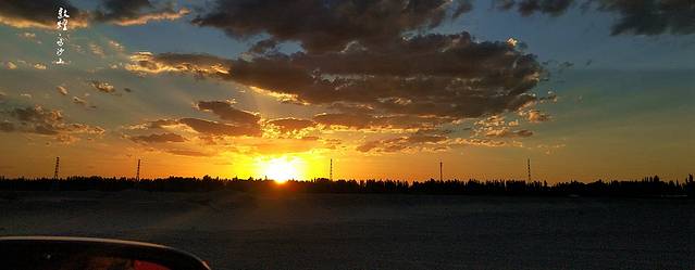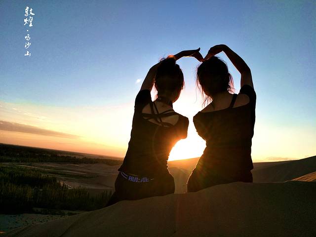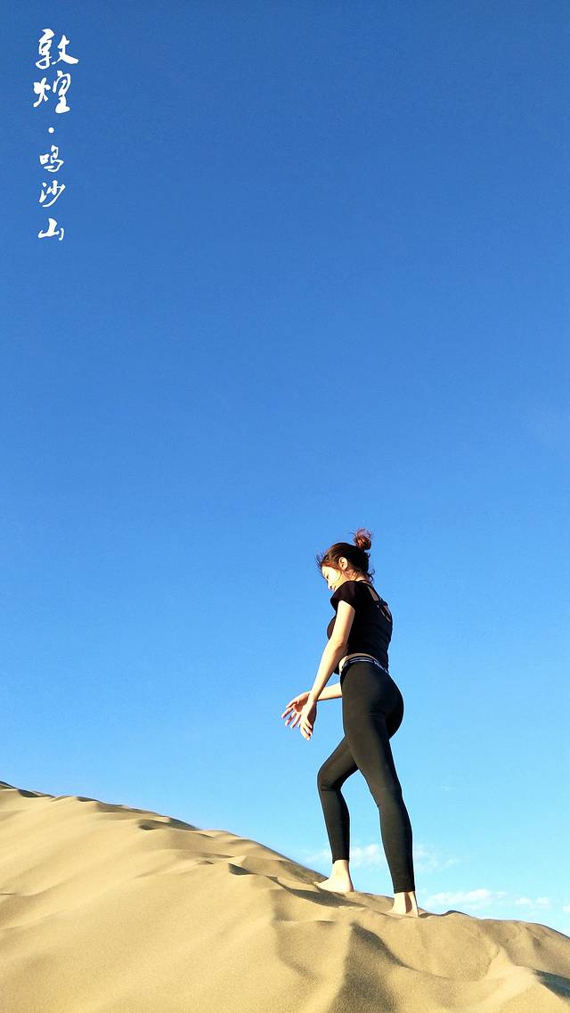 没有阳光之前,地面上的沙灰灰的,我们也一脸的嫌弃。焦急的等待,没有失望,太阳一点一点探出她娇羞的脸庞,渐渐的给沙漠洒下了一片金黄。沙漠中最美不过日出和黄昏,我们珍惜这次的日出,眼睛一眨不眨的看着日出的方向,把衣服脱下来,将手机放在衣服上,找了个位置固定,延时作品的拍摄就此展开。相机就这样拿在手上,拍摄各种姿态翻飞。我们爱惨了这样的寂静的日出时刻,旁边陌生的妹子让我们给她拍了照片,我们也逮住机会让她给我和闺蜜来了合照,于是有了后来的笑的脸抽筋,或许在别人眼中我们可能有病吧,毕竟两个人在沙漠中对着手机哈哈大笑,笑我们都是断臂维纳斯,藏的手太不标准了。有了金色和蓝色的背景色,我和kk忍不住在沙漠中逗留许久,卡擦卡擦的按着手机和相机,出了一些还不错,我们自己自以为是却爱不释手的“大片”,爱死了这片土地。接下来请安静欣赏我们作品。