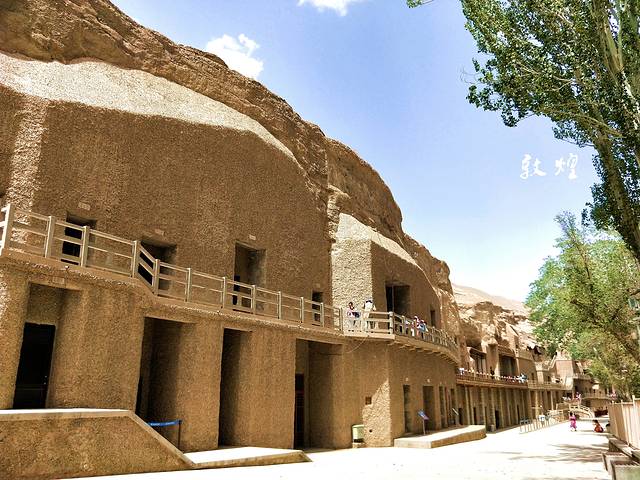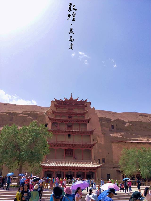 建议以后将要去的伙伴们,预约早上的票,可以看到蓝蓝的天衬托整个莫高窟。我们下午时分看到的天不是很蓝,因为太阳正耀眼。