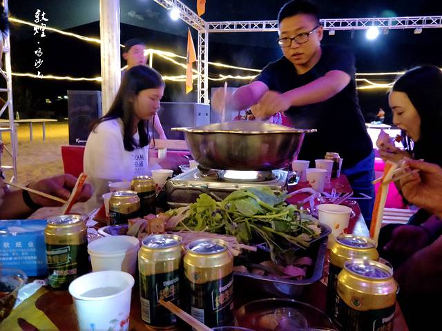 我们下山晚,到时已经高朋满座,我们随意找了一桌全部都不认识的陌生人,他们有些嫌弃的表情,果然和我们能吃苦的两个姑娘不一样,我们早已奔波劳累,肚子饿的呱呱叫,不管是肉还是蔬菜,吃了才会饱,本来就没多大期待,有一些麻花和水果,还有一些肉,冷冻食品,蔬菜就是晚餐的全部,当然还有免费的啤酒。我们也是津津有味,感叹着不虚此行。伴着火锅更有美妙的音乐舞蹈助兴,多么惬意的一晚,游戏环节和观众表演也让人眼前一亮,牛人很多,歌唱的棒棒的。吃完火锅后还有一盘烧烤,不多却是很值得的。再加上饭后的篝火晚会跳舞,把整个露营晚会推向了高潮,我们跳着唱着,开怀大笑着,烟花从身后咻的一下升起,炸裂,正是有朋自远方来,不亦乐乎,月圆之夜将我们的距离拉近,共畅饮,共欢乐。这里的回忆是美好的,欣喜的,出人意料的。