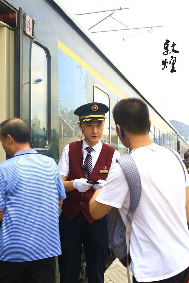 兰州大学之行结束后,去往敦煌的旅程就此打开了,我们背着大大的背包走到属于我们的车厢时,感慨了,惊喜了,乘务员竟然是一个十足的帅哥,虽然帅哥很高冷,但也很热情,工作需要,让他专注的眼神变得格外迷人。没错,作为颜控来说,帅哥的魅力是无穷大的,在列车上,忍不住多看他几眼。