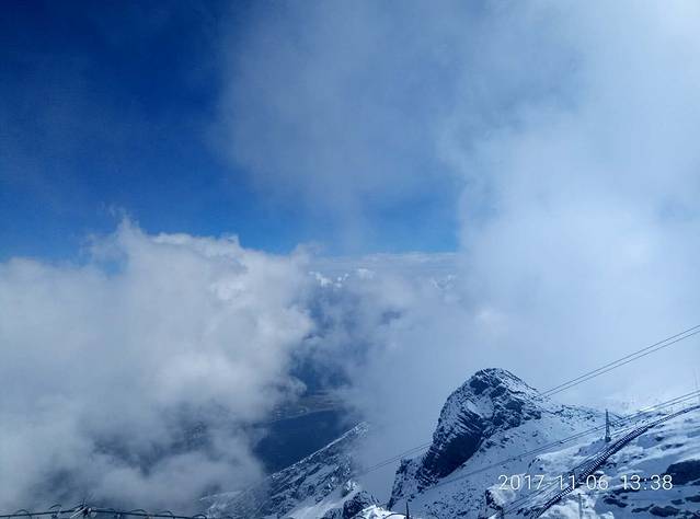 因为是跟团,所以导游都帮忙买好票给我,吃完午饭后(一定要吃饱,要不没力气爬雪山),我们就直接做索道抵达海拔4500米的高度,在索道沿途可以看到山脚的风景。索道到达4500米的平台后,周围云雾缭绕,因为我们去的当天没有下雪,而且中午阳光出来后,相对来说雪少了很多,但风景还是很壮阔的,听说对着雪山许愿愿望会成真哦。记得记得要抹防晒!虽然是冬天,但太阳出来后,紫外线非常强烈,很容易晒伤。最高旅客可到达的雪山最高点是海拔4680米,虽然有点高原反应,而且花了将近两个小时爬了不到海拔200米,但最终爬上上面的成就感还是很棒的。