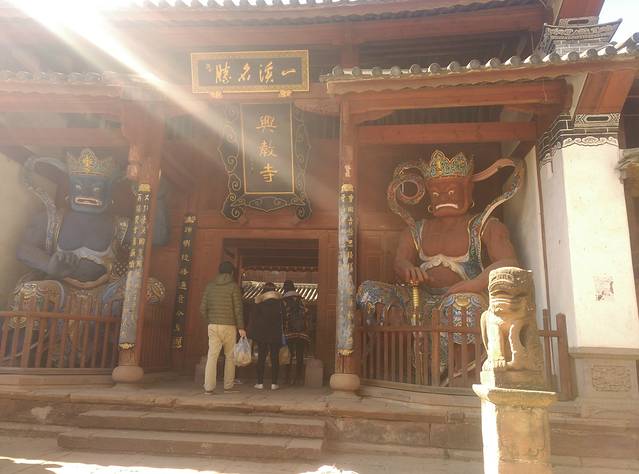 四方街有两棵槐树,一大一小。据说原来是两棵大槐树,在四方街修复过程中,其中一棵受了损伤,后来移植了一棵小的。四方街的两边,分立着古戏台和兴教寺。戏台上无人唱戏,兴教寺也无人参拜,更多的,成为了一种文化象征。兴教寺是白族阿吒力教的寺庙,门口哼哈二将雄赳赳气昂昂,更为神奇的是,这两尊雕像是木雕的。戏台正对寺庙,这是在别处没见过的景象,有一种说法是:诸天神佛也爱看戏,与民同乐。
