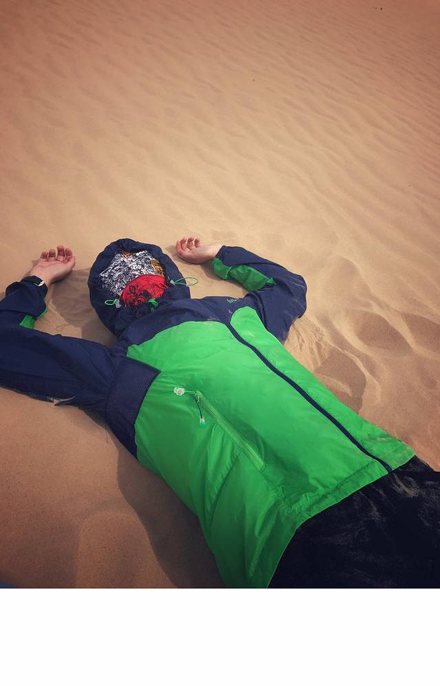 露营装备:帐篷、睡袋、防潮垫、头灯、电子蜡烛若干、小铁锹、锅碗瓢盆、生火工具、木头、炭、酒精块、充电宝、保温箱(冰镇矿泉水)、头巾、面罩(防沙、防晒),冰袖(除了防晒之外多准备几副吧,我的镜头都是套着冰袖的,沙子真的无孔不入,一定保护好相机),防晒霜,直男的百宝箱(什么刀子,剪子,说不出名字的各种家伙)、医药包、吃的喝的