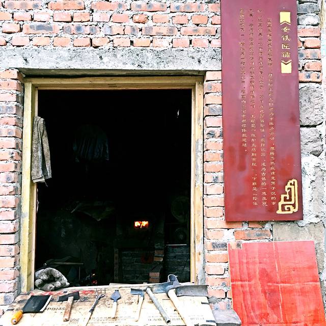 沿途路过的一家铁匠铺,窗口摆放着打制出售的铁具。