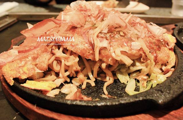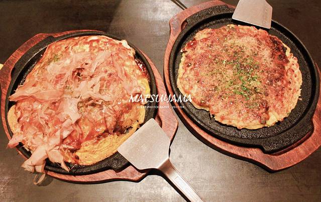 这家的铁板烧分三大类,広島風、関西風 キャベツ(圆生菜)和関西風 ねぎ焼(葱烧)。我选了広島風的「海賊そば入」,1600円。还选了一个関西風 キャベツ的「牛すじ玉」,800円。