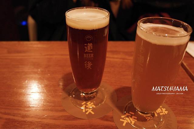 这家叫做「道後麦酒館」的店,最有名的就是当地酿的啤酒,分为金银铜三个奖项和限定四款,分别是「漱石ビール」、「マドンナビール」、「坊っちゃんビール」、「のぼさんビール」,我们要了银奖和限定款。容量的话分为グラス(250ml)500円、ジョッキ(500ml)860円和ピッチャー(1800ml)3200円三种,我们这是最小杯。