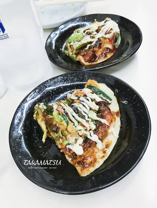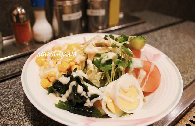 解决了行李的问题,出去找地儿吃饭,我们住的酒店附近巷子里有不少好吃的,选了一家铁板烧「お好み焼 みつ蜂 」。好像已经过了饭点儿,店里并没什么客人,点餐的的是位打扮很少女的欧巴桑,说现在点铁板烧的话,是厨师做好我们直接吃不用自己弄的那种,不知道饭点儿来是不是可以自己弄,感觉应该还挺好玩的,我们先点了个沙拉,端上了就是些新鲜的食材,桌上有很多种酱可以自己撒,欧巴桑给我们介绍了各种酱之后就拉上帘子出去了。