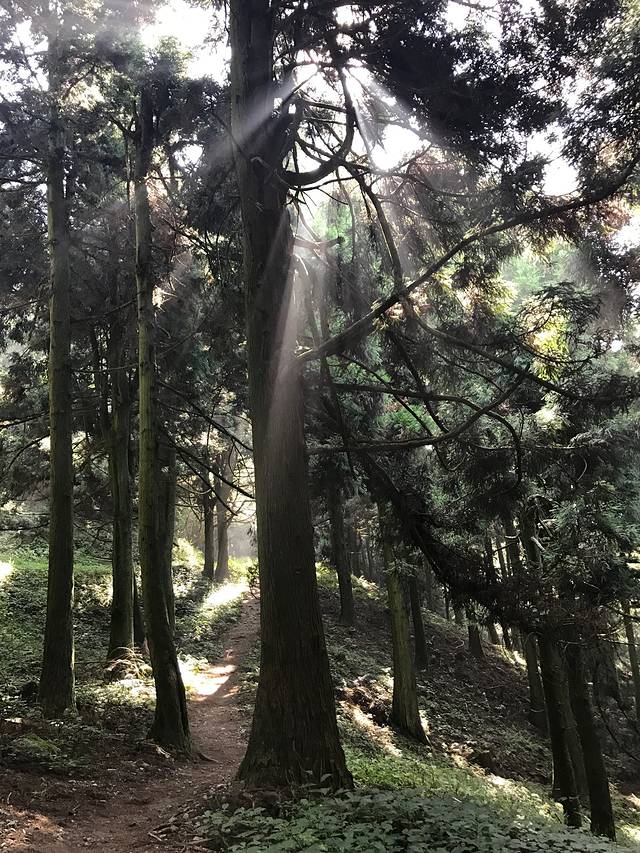 我和朋友坐在小树林休息了一会,山里真的很安静,阳光从树林里穿透,那刻真美……