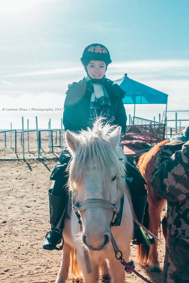 第二个项目:草原骑马。这里的马儿都是草原上独有的矮脚马,体型壮实,身手矫健。穿戴好护具走到马场,冷冷喜欢白色所以选择了一匹白马,而我选择了一匹长发飘飘的棕马。如果你会骑马,你可以单独骑着马撒丫子跑,如果你不会骑马,马夫就会带着你慢慢地溜达。由于我之前有一些骑马的经验,所以马夫就只在后面跟着我,也一直不停地让我提速,感受一下“策马奔腾”的刺激感。而冷冷的马夫则死死地拽着牵引绳,慢悠悠的享受着草原的阳光。