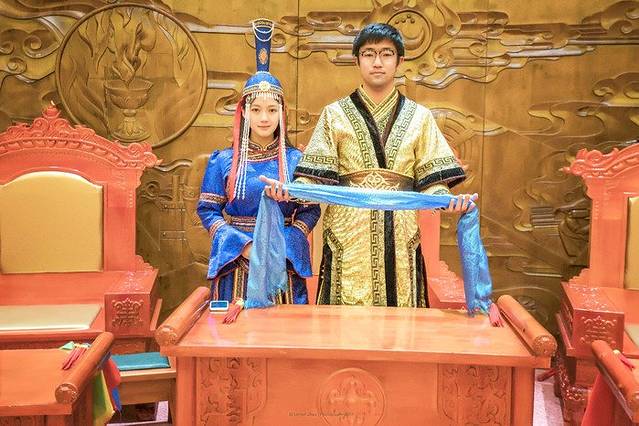 来到蒙古包,当然要试一试蒙古族的服装。我和冷冷换上了蒙古族的服装,穿上却有几分神气,似乎就是从这蒙古包里走出来的主人。