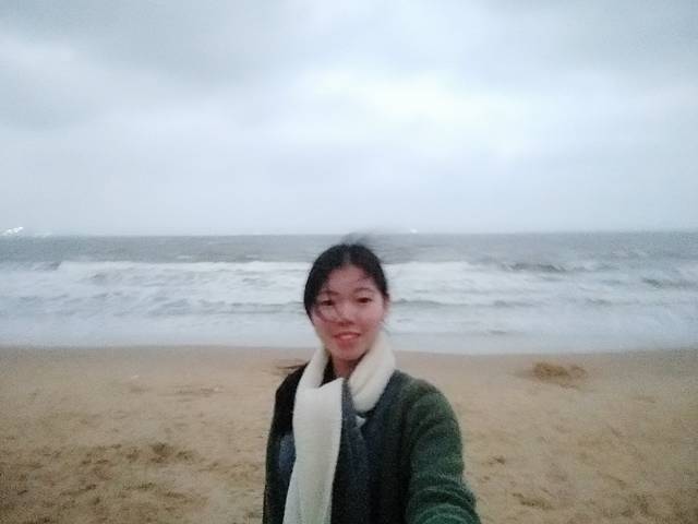 天已经完全暗下来了,正面拍照已经看不清人脸了。超大风,头发束了起来还是被吹得像是炸了毛一样。