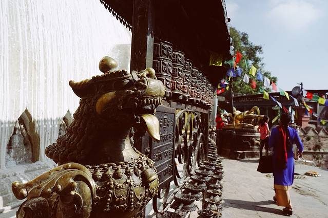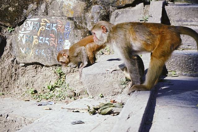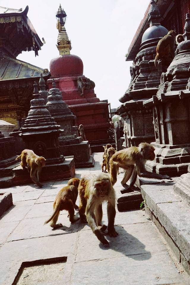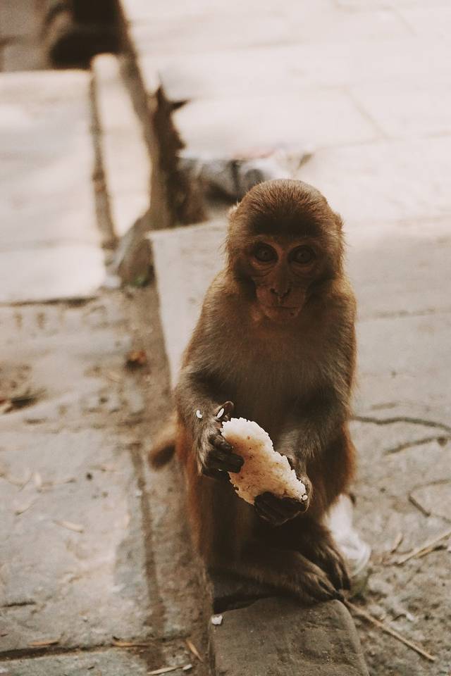 加德满都的动物们透露着迷一般的自由和任性,在猴庙特别明显。没有任何一只动物被绳子拴着,猴子们开心地在猴庙周边上串下跳,偶尔抢抢食物,偷偷贡品,打开人家楼顶的水桶盖玩玩。