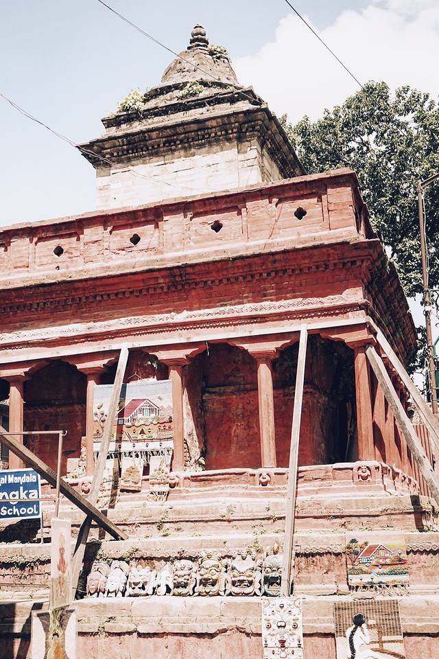 走进杜巴广场景区,路过老外街,看到前面有一幢精致的红色房子,就是库玛丽女神的居住地了。据说地震的时候,很多寺庙轰然倒塌,女神庙却安然无恙。即便如此,现在人们还是在它周围支起了很多柱子,支撑这栋建筑。