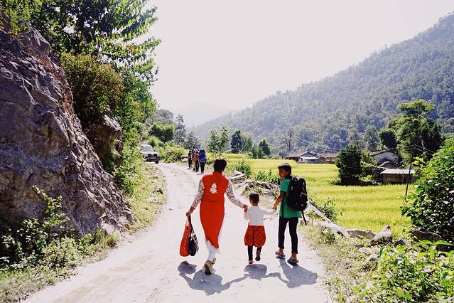 他把背包一个挂在他儿子正面,一个挂在他儿子背面,决定好姿势后,我们就这样出发。先要坐车去Nayapool。