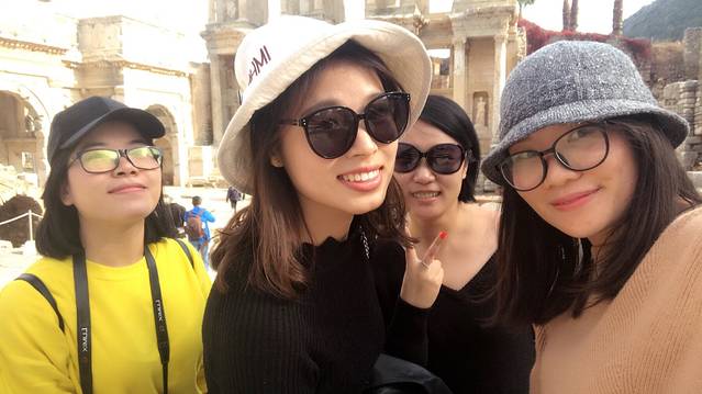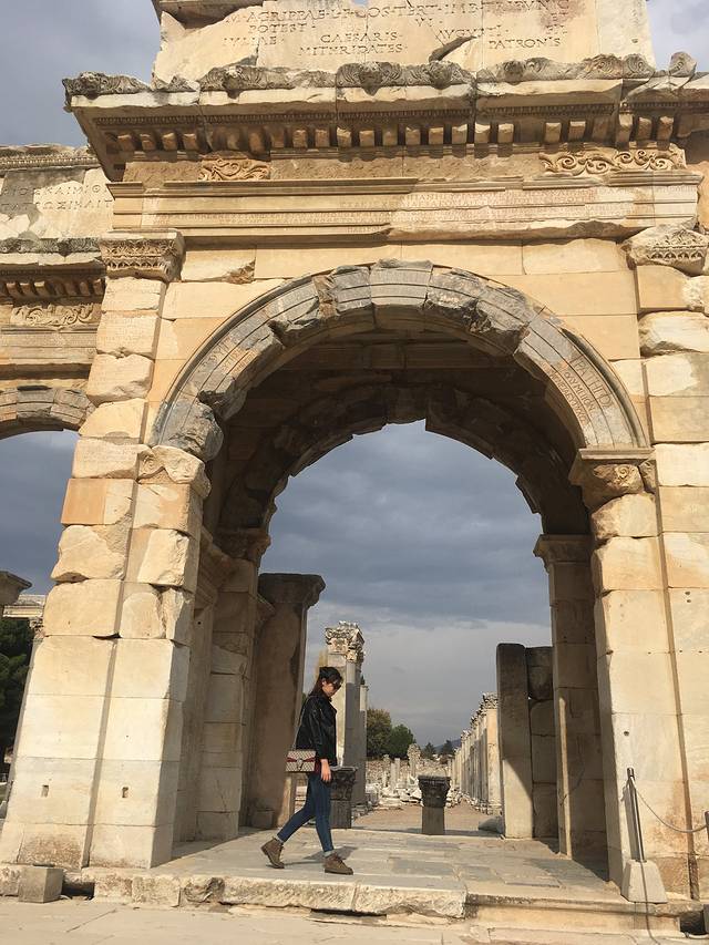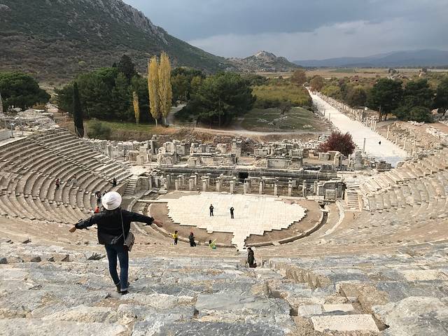 出了博物馆开车到了以弗所古城,对古迹的了解也就是在攻略上看了一些。进到景点就是一路拍拍拍,凹造型。走到以弗所大剧场附近就听到里面有人在唱《歌唱祖国》哇~在异国他乡听到这首歌的感觉也是超棒了。剧场是由罗马人在公元41年到公元117年间改造而成的一座环形大剧院。依山而建,面向大海,气势磅礴,坐席可容纳2.5万人。从舞台开始,坐席上每一排都比前一排更加倾斜陡峭的设计,改善了上层外围观众的视听效果。