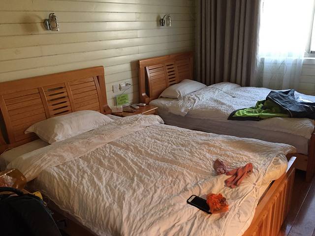高山小木屋的条件呢!500块一间呢。标间独卫。空调电视网络电热毯浴霸都有。唯独没有热水热水。室外温度5度,让我们洗冷水澡。什么热水坏了师傅在修要2-3小时,骗人!
