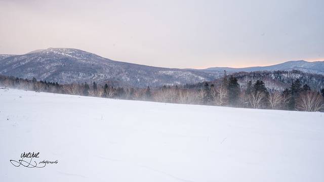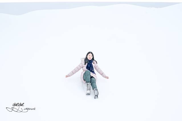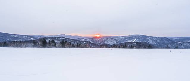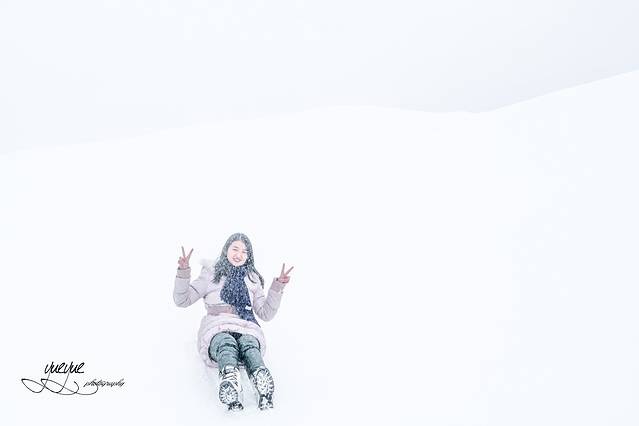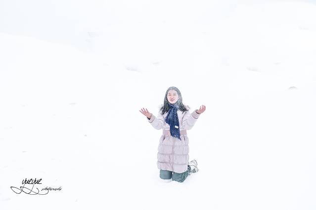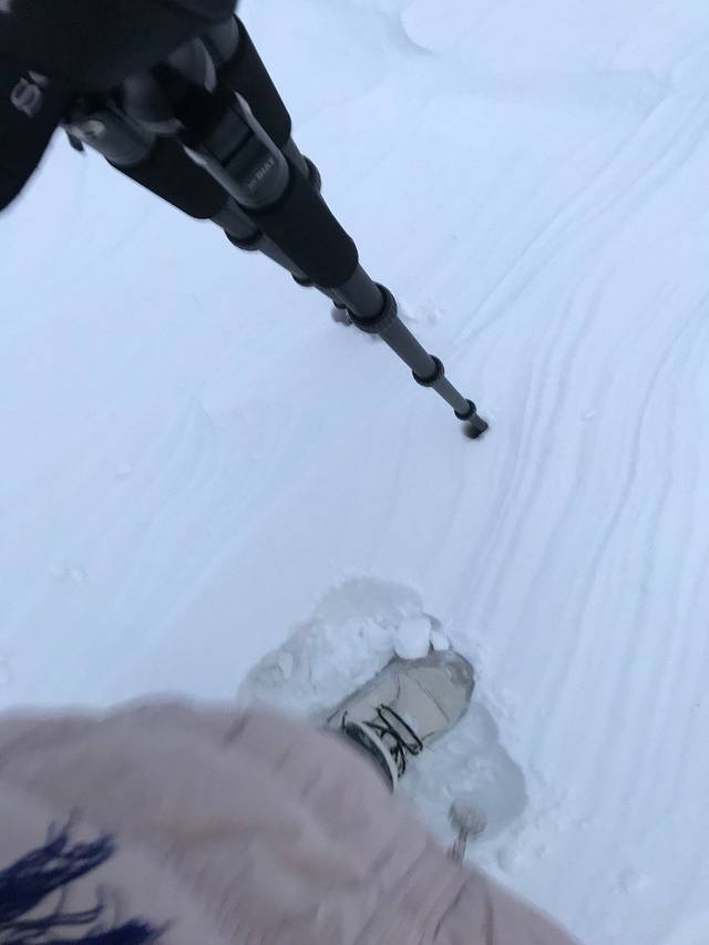 大街都躲在山上唯一的一做酒店的屋檐下面,因为外面风实在太大了,冷的受不了。我突然想往前面走走,因为前面一片雪地拍日出的话就没什么前景了,于是我开始一步一步地往前走,我想穿过雪地走到山边,雪好深,莫过了膝盖,感觉是这是一片从未有人涉足过的雪地,保留着风吹过后的平整,我把三脚架当作拐杖一步一步往前走,还摸索了出了怎么不让脚在雪地里陷得太深的方法,就是可以把要踩的地方的周围的雪都略微先踩一下,这样整个的受力面积大,就不容易陷下去了。奇怪的就是,带上了羽绒服的帽子走在雪地里,反而不太冷了,只听到风在耳边呼啸,在吹打着我的身体,但仿佛置身事外了一般,我不觉得冷了。就是感觉这片雪地好大,看着山边就在前面,可是怎么走也走不到。