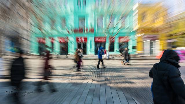 第二天起来走出门,走在中央大街上,寒冷的天气感觉人与人之间的距离都比较疏远。不经意间的旋转镜头,居然拍出了我对哈尔滨的印象..