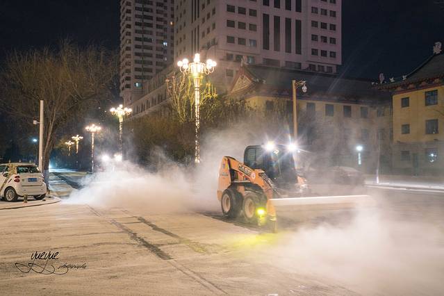 我们慢慢走回去,,下雪了,地面积了一些雪,有点滑,路上有很多扫雪车已经在工作了,宽阔的大马路甚至有五六量扫雪车错落并排着扫雪的壮观景象...