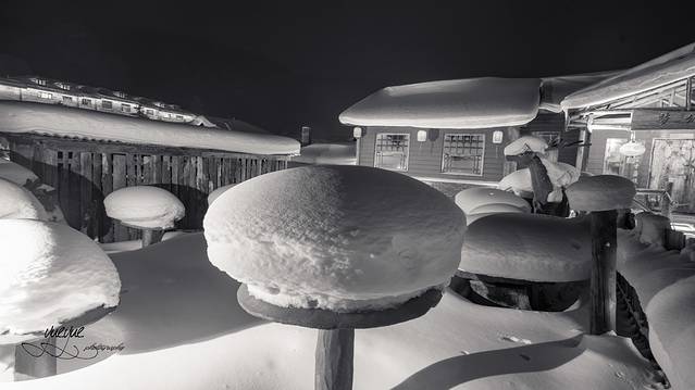 广哥和我说那里由于气候的原因,雪的湿度大,黏度大。而且下了不化,所以房顶上的雪可以覆盖成一朵朵蘑菇的形状