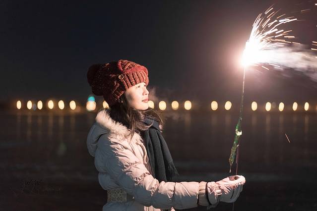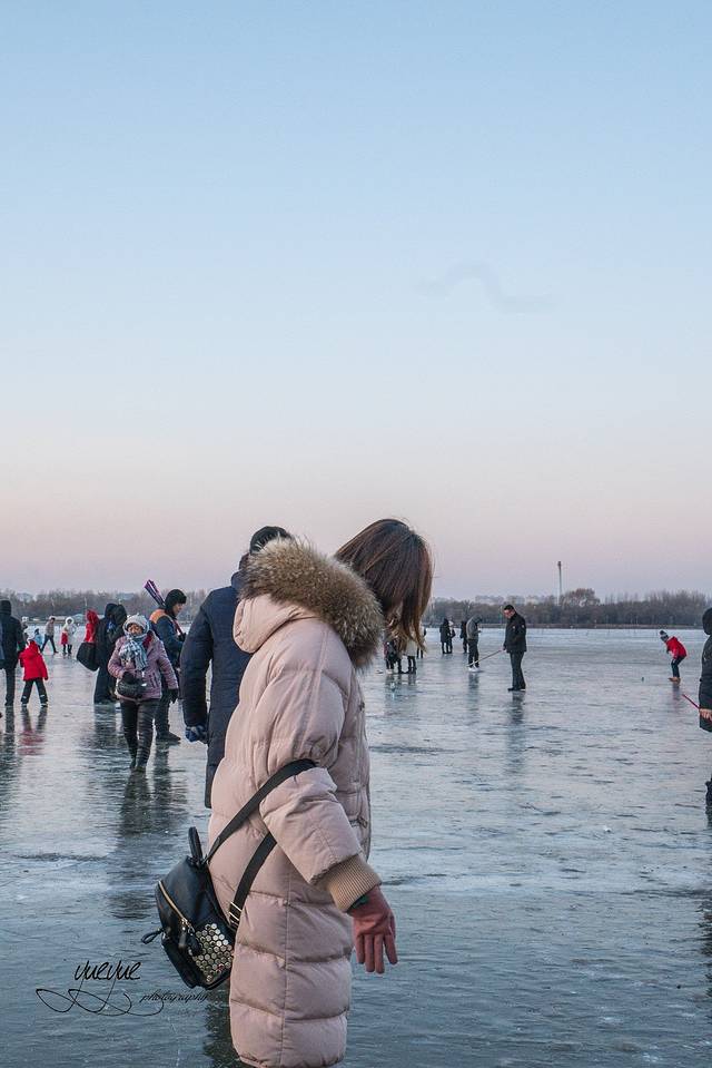 天渐渐变暗,好多人在江面上玩起了烟花,烟花的倒影在江面上,冰天雪地里的火花,感觉有种温馨的氛围。可惜拍糊了
