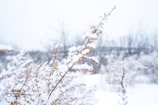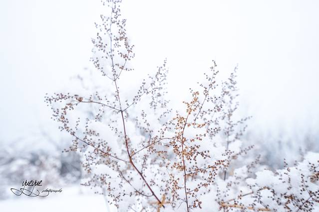 雪落在小草植物上,像柔软的蒲公英,为这个寒冷的世界添加了一些温柔的色彩