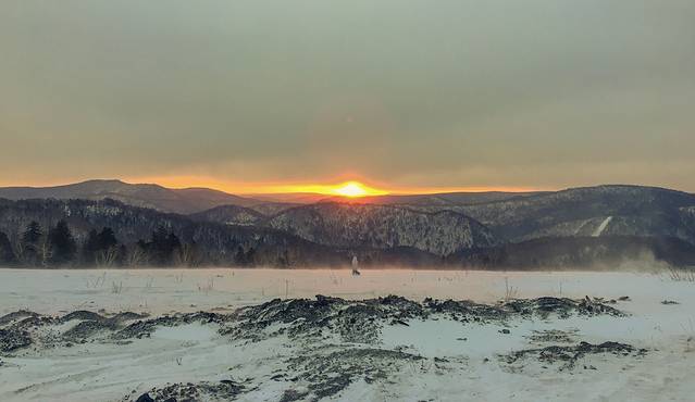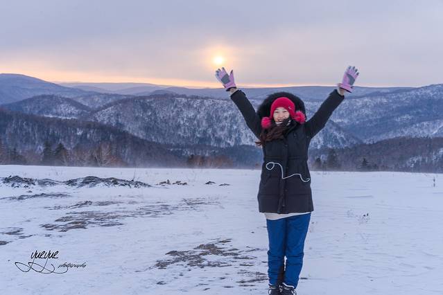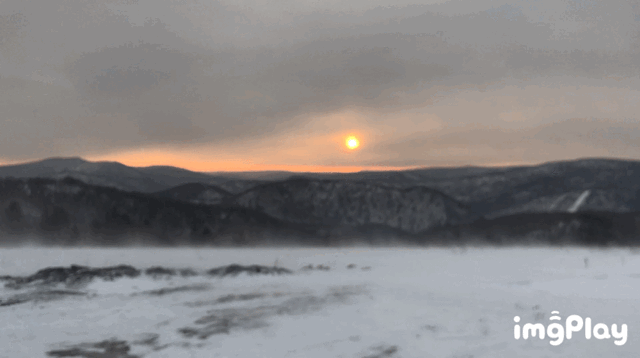 早上5点钟客栈老板就来接我们了,我穿上了最厚的装备,还贴了几块暖宝宝,天还黑着,他带我们上了一辆有点像加了座位的货车的车子,然后往山上开,大概十几分钟到了山顶,山顶狂风呼啸,这大概是我看的天气最恶劣的日出。上了山,天已经朦朦亮了,但是太阳还美出来,前面是一片白茫茫的雪地。还有远处的山峰,风呼啸得卷起地面的雪花,天气并不是很晴朗,我们都一度觉得要看不到日出了。