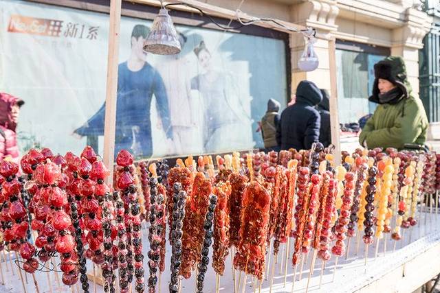 东北的冰糖葫芦也好漂亮,有草莓,山楂,枣子之类很多不同的水果,懂别的冰糖葫芦和南方的不同,冰糖葫芦实在室外动起来的,拿到室内就慢慢融化了,不过山楂也会变软,吃起来别有一番风味的感觉,山楂很新鲜,像刚从树上摘下来的一样,酸酸甜甜的特别可口,