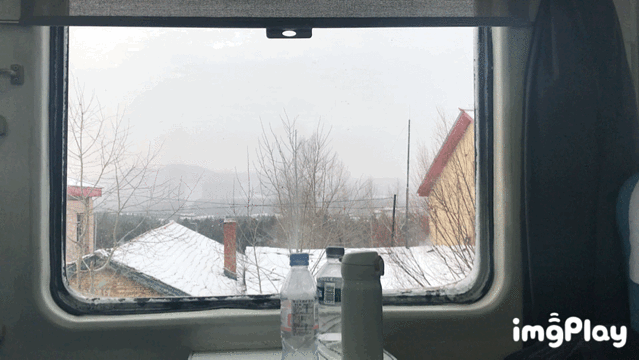 早上到了漠河,外面好冷,火车的车窗上都结冰了,(结冰的图)