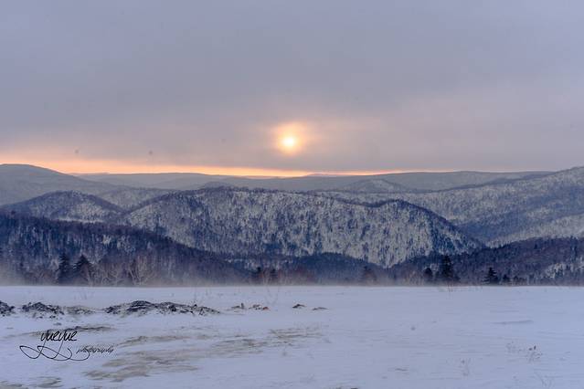 就在这时候太阳居然出来了,躲在朦朦胧胧的雾后面,显得凄美而壮观,从来没有见过这样的日出,实在太壮美了,天上是朦胧的太阳,地上是寒风卷起飞雪。于是立刻架起三脚架开始拍..