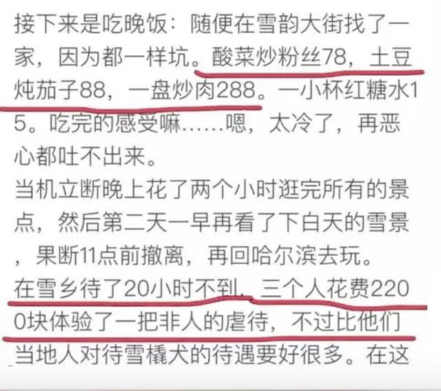 今天被一篇雪乡的文章刷屏,名为《雪乡的雪再白也掩盖不掉纯黑的人心!别再去雪乡了》。作者一木行是常年旅行的情侣,里面历数了雪乡的几大坑,现实定好的住宿被临时要求加价否则走人,然后是吃的贵到离谱,更有各种忽悠游客的天价游玩项目。