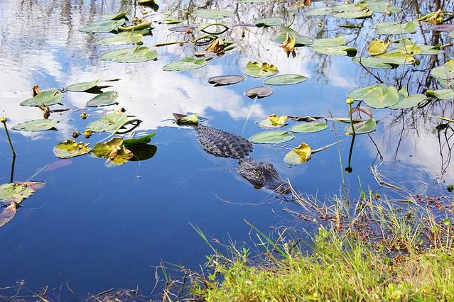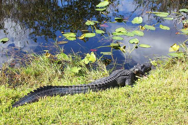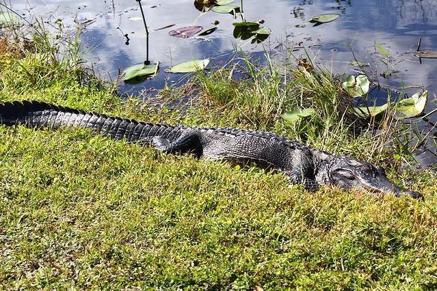我们的guide非常knowledgable,一路听下来能知道很多关于这个公园、鳄鱼、鸟儿和迈阿密的自然知识,还专门下水给我们展示当地特有的一种水草。大沼泽国家公园的大小是美国除了阿拉斯加地区以外仅次于死亡谷的。我记忆最深刻的就是他说鳄鱼会用泥巴和水草在水里建很多个alligator hole来存水,这样到了旱季的时候就不会缺水。这个鳄鱼洞不仅养活它自己,别的很多动物(例如水鸟)也会进入洞里维持生存;当然会不会成为鳄鱼的食粮就看它们的运气了haha。大沼泽公园里的鳄鱼是杂食动物,什么都吃。我们观光车一路上看到无数只(真的是无数只)鳄鱼,最开始还是很惊喜的,后来都有些看烦了,实在是太多。鳄鱼一般注意到车开过还是会很警惕,但不会主动攻击。虽然我看到的鳄鱼一条条的都是在水边惬意地晒太阳,懒得不行。当然为了安全还是不要靠它们太近。