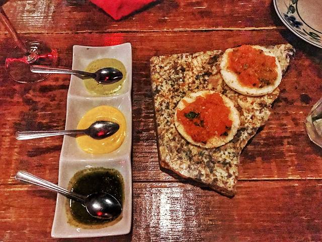 之后打个uber回酒店,真是感觉精疲力尽,就随便yelp了一家就近的餐厅Bolivar Restaurant Bar,味道相当不错,装修也很有味道。有趣的是,他们家我和某羊觉得最好吃的是他们免费供应的一道头台——两块拌着salsa的小饼干,配了三种味道的hot sauce——好吃呀!