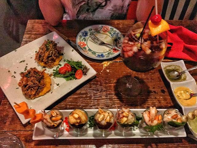 牛肉饼干夹,sampler ceviche配sangeria。都很好吃。沾着三种辣酱吃更是超赞!